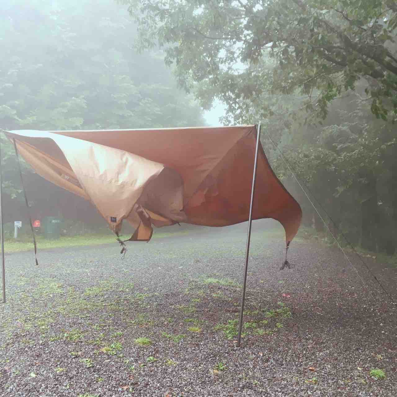 風が弱まったといっても、タープが躍動感たっぷりにバッサンとたなびいてます。